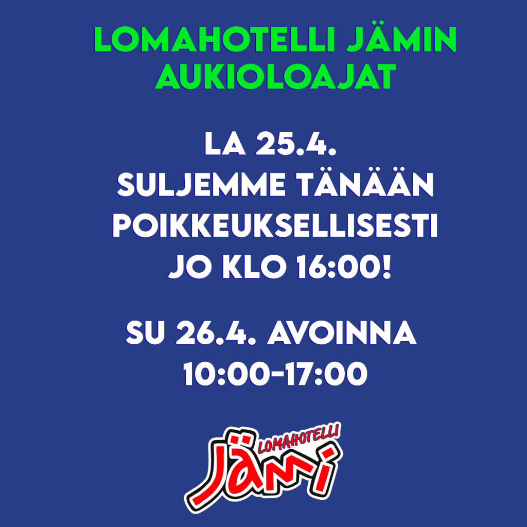Aukioloajat ja välineet: Minigolfrata on avoinna kesäkaudella Lomahotelli Jämin aukioloaikojen mukaisesti. Mailat ja pallot saat kätevästi Hotellin Ravintolasta.
